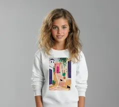 Un gatto bianco sonnecchia pacificamente in un classico arco mediterraneo ornato di bouganville rosa, affacciato su un mare blu. Questo pezzo cattura perfettamente il fascino sereno e solare di un'isola greca.