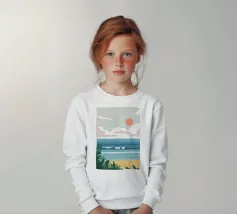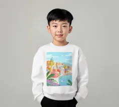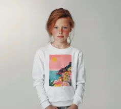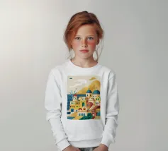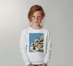 Una pittoresca illustrazione degli iconici edifici bianchi e delle cupole blu di un'isola greca, probabilmente Santorini, affacciata sul mare. La scena è una perfetta rappresentazione, inondata di sole, di un paradiso mediterraneo.