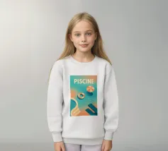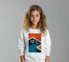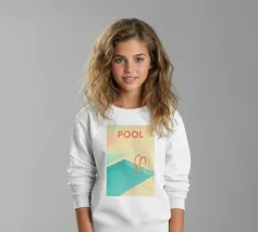Poster raffigurante una piscina estiva con una scala arancione e riflessi d'acqua stilizzati. Un gioco di ombre, luci grafiche e una tavolozza solare. Perfetto per un look vintage e rinfrescante.