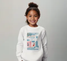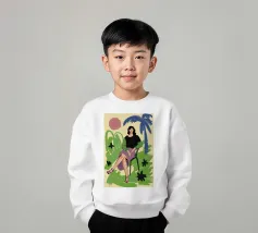 Un'elegante illustrazione di una donna che si rilassa su una scala illuminata dal sole accanto a una palma in vaso, con un gatto seduto vicino. La scena, incorniciata da un arco, è serena, elegante e ha un'atmosfera mediterranea classica.