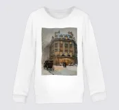 Un romantico paesaggio urbano dal sapore invernale: una carrozza nera trainata da cavalli si ferma nella neve fresca davanti a un magnifico edificio antico con finestre illuminate in modo caldo. Due persone elegantemente vestite sono impegnate in una conversazione, mentre i lampioni gettano una luce dorata sulla strada innevata. La scena racconta di un'epoca passata, dell'eleganza e della tranquilla bellezza di una serata innevata in città.