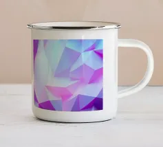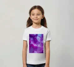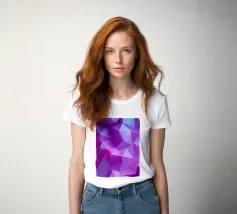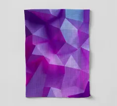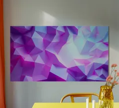 Una vibrante composizione astratta presenta una miscela di tonalità viola e blu, formando forme geometriche nitide e transizioni fluide che creano profondità e movimento.