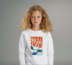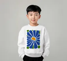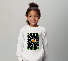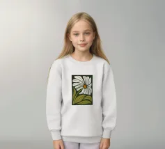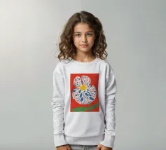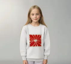 Un'illustrazione audace e grafica di un singolo grande fiore, probabilmente un anemone, con petali a strisce bianche e blu e un centro giallo. Lo sfondo rosso brillante rende il fiore il fulcro assoluto di questo pezzo potente.