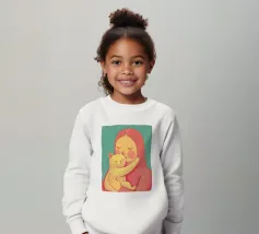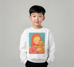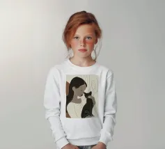 Una persona che indossa un vivace top arancione tiene vicino un elegante gatto nero, i loro sguardi sono allineati, evidenziando il forte legame tra l'uomo e l'animale domestico su uno sfondo semplice e dai toni caldi.