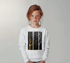 Il dipinto digitale di una foresta autunnale presenta sagome scure di alberi su uno sfondo caldo e dorato. L'opera d'arte testurizzata mostra un fogliame dettagliato nei toni dell'arancione e del marrone, creando una scena di bosco serena e suggestiva.