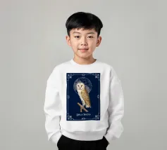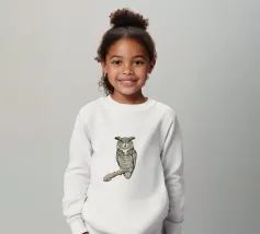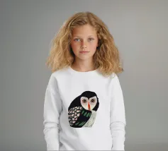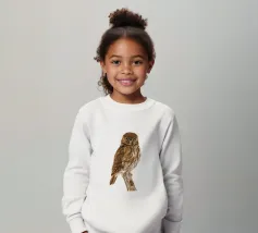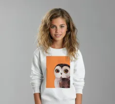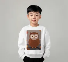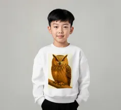 Un dipinto a olio di un gufo dall'aspetto simpatico e divertente. Si tratta di un uccello marrone chiaro con grandi occhi arancioni. Gli occhi del gufo sono un po' irregolari, il che lo fa sembrare ancora più buffo e dolce. Sembra anche un po' spaventato con i suoi occhi rotondi.