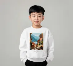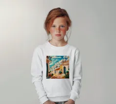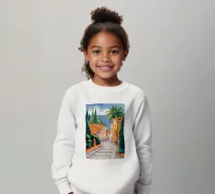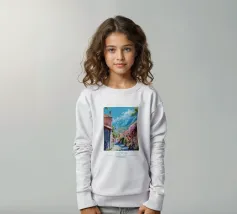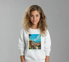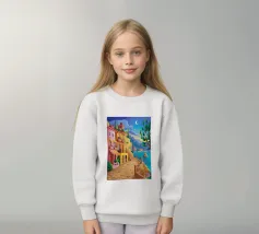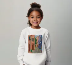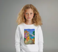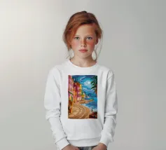 Una veduta prospettica di una strada europea stretta e tortuosa, fiancheggiata da edifici colorati, piante in vaso e diretta verso un cielo luminoso e nuvoloso.