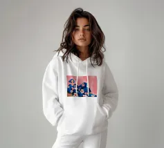 Questa opera d'arte ritrae una persona avvolta da piante verdi e rigogliose, che indossa un abito bianco con motivi arcobaleno. L'arco rosa sullo sfondo aggiunge un sereno tocco botanico.