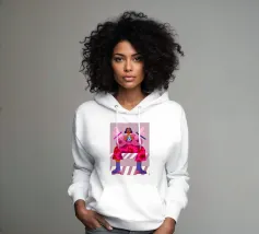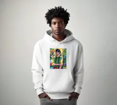Questa opera d'arte ritrae una persona avvolta da piante verdi e rigogliose, che indossa un abito bianco con motivi arcobaleno. L'arco rosa sullo sfondo aggiunge un sereno tocco botanico.