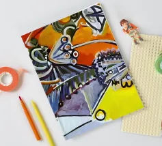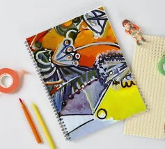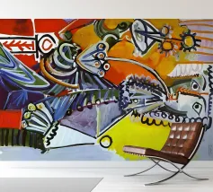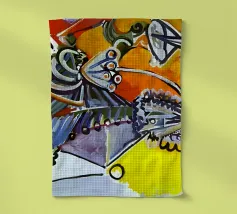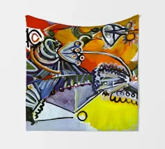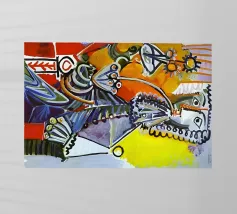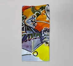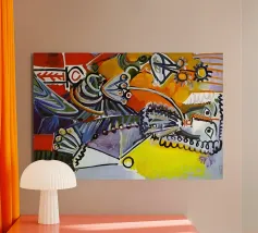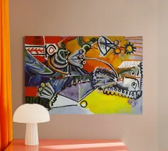 Questo dipinto astratto vibrante ed energico presenta un gioco dinamico di forme frammentate e linee audaci, con una ricca tavolozza di arancioni, gialli, viola e blu. La composizione suggerisce elementi decostruiti, forse figure o oggetti, in un movimento vorticoso ed energico, caratteristico delle influenze cubiste ed espressioniste astratte. I dettagli intricati e i colori contrastanti creano un'esperienza visiva accattivante e stimolante. Questo poster digitale di alta qualità (7000x5000 pixel, 300 dpi) cattura magnificamente l'energia grezza e il genio artistico dell'originale, ma