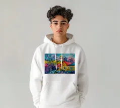 Quadro astratto dinamico che presenta un'architettura surreale, vivaci toni arancioni e blu, alberi astratti e sfere fluttuanti in un paesaggio fantastico. I tratti strutturati e i contrasti decisi creano un'atmosfera onirica ed energica.
