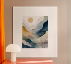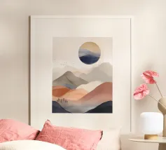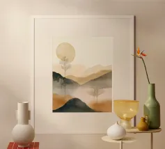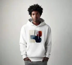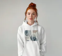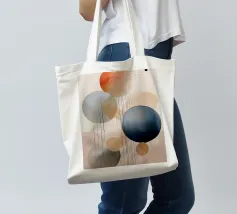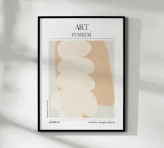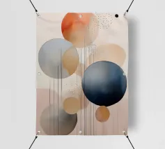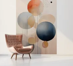 Una moderna composizione astratta con forme circolari sovrapposte nei toni tenui del beige, del pesca e del blu. Le linee delicate e le trame sottili creano profondità e movimento, mentre i puntini sottili aggiungono un tocco giocoso e raffinato. Questo design minimalista combina eleganza e fascino contemporaneo, rendendolo un pezzo versatile per gli interni moderni.