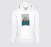 Illustrazione minimalista e serena di un sole che sorge su un mare calmo. Le semplici forme geometriche e la tavolozza di colori tenui creano un forte senso di tranquillità e la tranquilla bellezza di un nuovo giorno.
