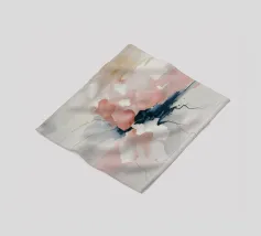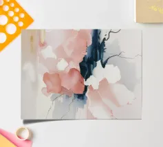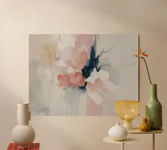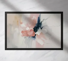 Un delicato pezzo floreale astratto con una forma centrale simile a un fiore in bianco e rosa tenue, con linee più scure simili a inchiostro che si irradiano verso l'esterno, come se svelassero l'anima di un fiore su uno sfondo tenue. Stile Melissa Herrington.