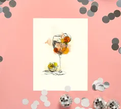 Celebrate la gioia dell'estate con questa giocosa illustrazione line art di un cocktail Aperol Spritz, completo di una fetta di arancia e di vibranti accenti circolari in rosa, arancione e giallo. Questa opera d'arte minimalista ma espressiva unisce eleganza e freschezza, catturando l'essenza dell'ora dell'aperitivo con un tocco moderno e artistico. Ideale per cucine, bar di casa o qualsiasi altro spazio che desideri un tocco di colore e buone vibrazioni.