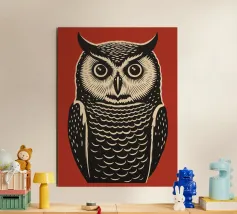 La nostalgia della xilografia incontra l'arte murale moderna: questo carismatico gufo celebra la potente estetica della tecnica tradizionale della xilografia con uno schema di colori contemporaneo. Il colore rosso intenso ricorda i classici manifesti di propaganda, mentre le precise strutture delle piume richiamano l'arte medievale. Gli occhi ipnotici creano una presenza mistica a metà tra arte popolare e design contemporaneo. Una dichiarazione senza tempo per chi apprezza l'artigianato tradizionale e la raffinatezza moderna: pura magia da parete.