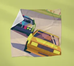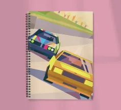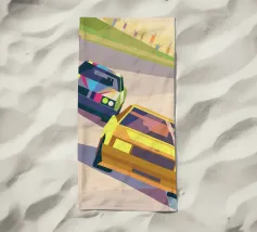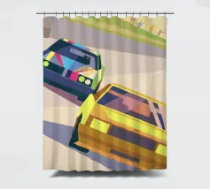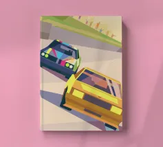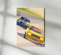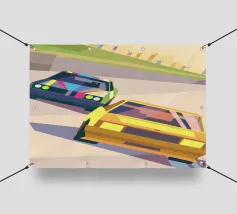 Illustrazione di due auto da corsa che si sfidano in pista con uno stile geometrico dinamico.