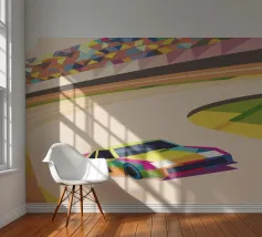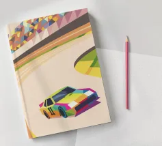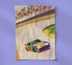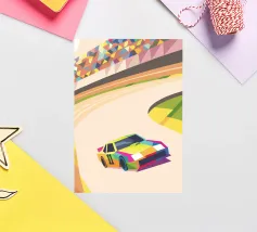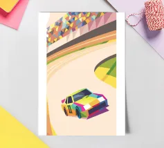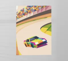 Illustrazione di un'auto da corsa in pista con colori vivaci e uno stile geometrico moderno.