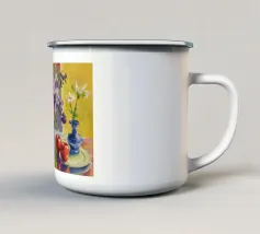 Una vivace composizione di natura morta con profumati lillà viola in un vaso blu intenso, accanto a un vaso blu più piccolo, mele verdi e limoni gialli, il tutto su un allegro sfondo giallo.