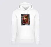 Un tradizionale motivo natalizio: Babbo Natale con cappotto rosso e sacco dei regali si trova davanti a una porta d'ingresso rossa, decorata con una ghirlanda, luci e regali. La delicata nevicata e i colori caldi creano un'atmosfera di festa nostalgica e piena di magia e gioia. Perfetto come immagine natalizia, poster di Babbo Natale, arte natalizia retrò, illustrazione invernale, arte murale festosa, idea regalo di Natale, arte natalizia nostalgica, decorazione natalizia, poster festivo, opera d'arte natalizia e accogliente decorazione domestica.
