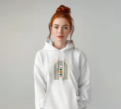 Le forme geometriche sono disposte in una composizione equilibrata con cerchi, archi e semicerchi in tonalità tenui. Il design è caratterizzato da un gioco di linee e forme che creano un senso di simmetria e armonia.