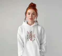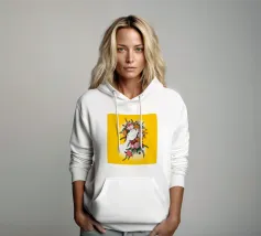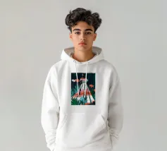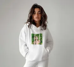 Avvolta da motivi floreali, una figura si erge con grazia tra la vegetazione lussureggiante. Foglie vibranti e petali rigogliosi incorniciano la loro silhouette, formando un ipnotico tableau naturale.