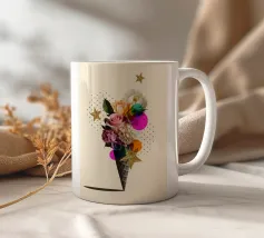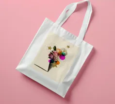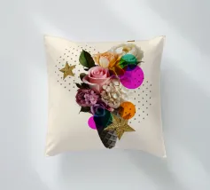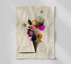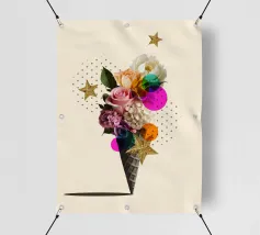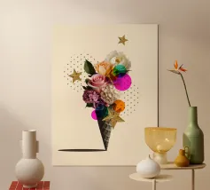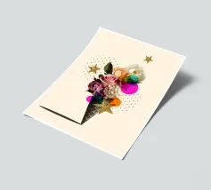 Stravagante arte del collage con un bouquet di rose, peonie e stelle glitterate dorate. Un tocco gioioso e surreale di design a tema floreale e alimentare.