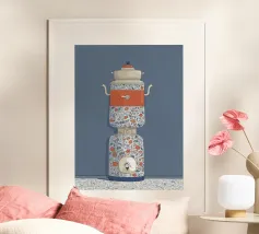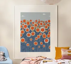 Un campo infinito di fiori grafici nei colori vivaci dell'arancio, del blu e del crema: moderno, giocoso e pieno di energia. La ripetizione ritmica crea una sensazione di infinito e leggerezza. Questo motivo porta il calore dell'estate e una moderna dichiarazione di design in ogni stanza.