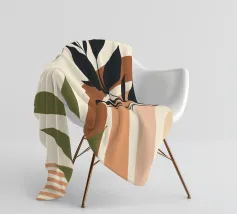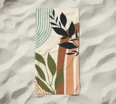 Foglie stilizzate in nero e verde si stagliano su uno sfondo di strisce curve e fluide in morbide tonalità di terra. Il disegno combina elementi botanici con forme geometriche astratte per un look moderno.