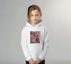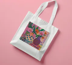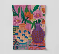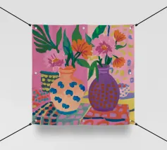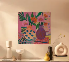 Una vibrante ed eclettica natura morta con un bouquet di fiori in due vasi con motivi diversi, uno a macchie e uno a ghirigori. La tovaglia a motivi aggiunge un mix gioioso e massimalista di colori e design.