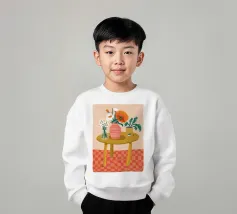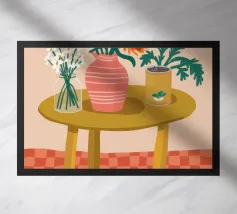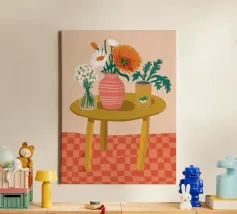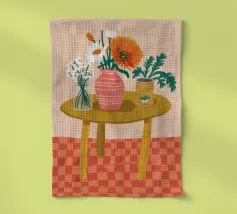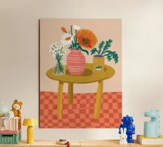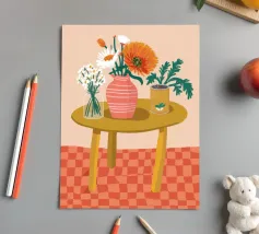 Un'affascinante natura morta di un semplice bouquet di fiori bianchi e arancioni in un vaso, seduto su un tavolo con una tovaglia a scacchi rossi e bianchi. La scena ha un'atmosfera calda, rustica e leggermente nostalgica.
