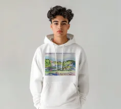 In questo acquerello, due piccole cabine rosse si trovano vicino al bordo dell'acqua, adagiate su una riva rocciosa alla base di montagne alte e frastagliate. Le scogliere si ergono ripide alle loro spalle, dipinte con pennellate di grigio, blu e viola. Il fiordo stesso riflette i toni freddi del turchese e del blu profondo, suggerendo un'acqua calma e limpida. Il cielo sovrastante è morbido e atmosferico, con accenni di luce che si fanno strada. Lo stile è sciolto ed espressivo, con pennellate visibili e forme astratte che suggeriscono piuttosto che definire, conferendo alla scena una qualità onirica ed emotiva.