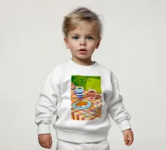 Una classica scena di colazione con un croissant su un piatto e una tazza di caffè con cannuccia a righe, su una tovaglia di percalle gialle. La composizione è calda e invitante, con un'atmosfera da caffè accogliente e senza tempo.