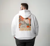 Una donna siede rilassata al centro di una luminosa tonalità di arancione. Il suo vestito a righe e il suo top floreale sembrano un mix di illustrazione di moda e arte moderna. Linee decise, colori caldi e un'ambientazione stilizzata fanno oscillare questo quadro tra serenità e forza. Una composizione che celebra la femminilità, la calma e la forza allo stesso tempo, ispirata alla grafica moderna e all'atmosfera mediterranea.