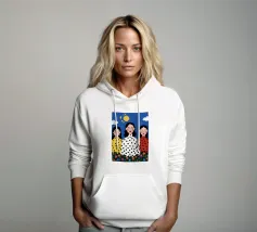 Un'illustrazione eccentrica e minimalista mostra un primo piano di tre paia di gambe affiancate, che indossano calzini a righe verdi e bianche abbinati.