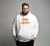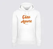 Un motivo ridotto ma potente che cattura il calore e l'affetto italiano in forma tipografica: La scritta "Ciao Amore" appare in corsivo curvo e grassetto in rosso vivo - senza ombre o effetti, ma chiara, diretta ed emotiva. Sotto, più piccola ed elegante, la firma "studio scusi", che sembra un timbro personalizzato.