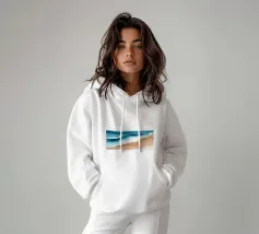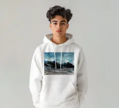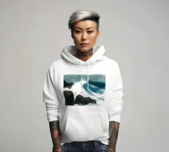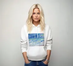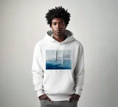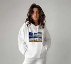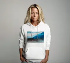 Una sognante miscela di nuvole soffici e blu vibranti crea un'ampia vista panoramica di cielo e mare. Il gioco di luci e colori è al tempo stesso arioso e solido.