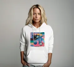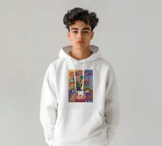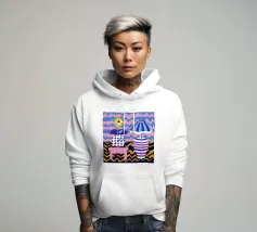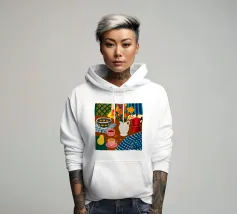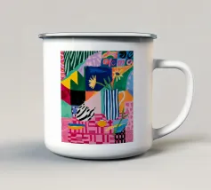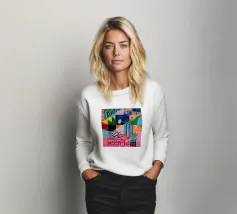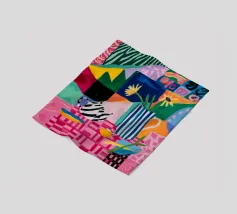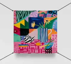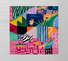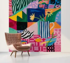 Un collage vibrante e caotico di motivi contrastanti, tra cui righe, pois e forme organiche. La gioiosa esplosione di colori e texture crea un'opera d'arte energica e piena di vita.