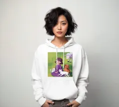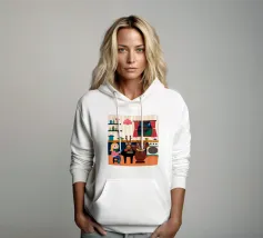 Un'ambientazione serena sulla spiaggia presenta un gatto seduto su cuscini impilati insieme ad altri due gatti, tutti intenti a guardare il tramonto. Le tonalità tenui e l'atmosfera pacifica evocano tranquillità e unione.