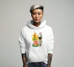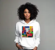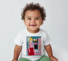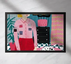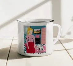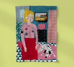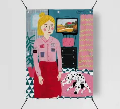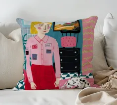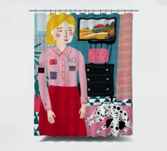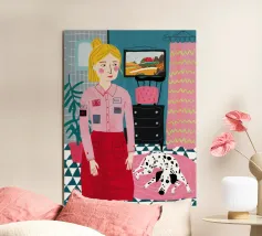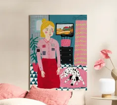 Una donna si trova in una cucina dai colori vivaci con un dalmata al suo fianco, una finestra che mostra una scena all'aperto e vari dettagli della cucina, creando un'illustrazione domestica eccentrica e affascinante.