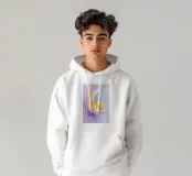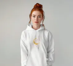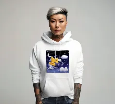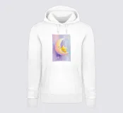 Una luna dipinta a mano a guazzo abbraccia una piccola stella, entrambe sorridono dolcemente. I toni pastello e le texture delicate creano una cameretta sognante e rilassante con uno sfondo pulito e pastello.