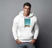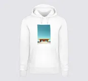 Una casa moderna e simmetrica si staglia audace sotto un cielo turchese infinito. Il vivido contrasto tra la facciata arancione bruciato e il cielo fresco e aperto evoca serenità, precisione e calore. Questo ritratto architettonico celebra il minimalismo, l'equilibrio e la quiete di un pomeriggio assolato.
