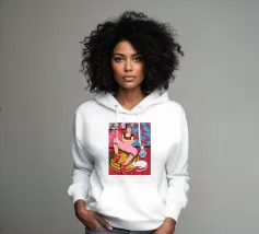 Un ritratto stilizzato di una donna con fluenti capelli scuri circondata da un'abbondanza di fiori e frutti colorati, che celebra la vita, la fertilità e la creatività.