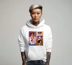 Questo dipinto raffigura una persona con i capelli neri che indossa un abito colorato con forme geometriche. Lo sfondo è rosso e la persona è adornata con grandi orecchini circolari.
