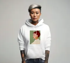 Questo dipinto raffigura una persona con i capelli scuri acconciati in due chignon, che indossa grandi orecchini arancioni. Il volto della persona è dipinto con audaci motivi rossi e bianchi, mentre lo sfondo è di colore rosso pieno.