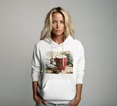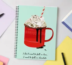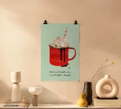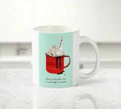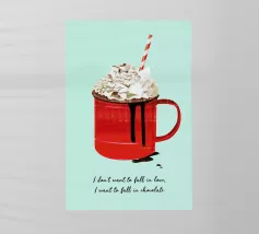 Un'illustrazione spiritosa, deliziosa e golosa di una tazza piena di cioccolata calda e panna montata. Il testo dice: "Non voglio innamorarmi, voglio innamorarmi della cioccolata".