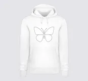 Una farfalla in vista frontale è al centro del motivo. Le ali superiori e inferiori sono disegnate come contorni morbidi e chiusi, il corpo rimane snello, le antenne e i punti di attacco sono solo accennati. La rappresentazione utilizza costantemente una line art minimalista, un contrasto tra bianco e nero e molto spazio libero. Il risultato è simmetria, leggerezza e una chiara attenzione ai contorni e alla forma.