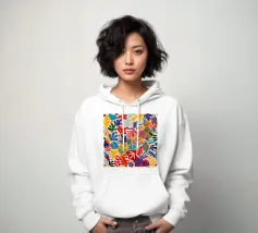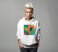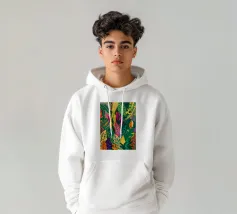 Una composizione astratta ed energica di foglie e forme rese in una tavolozza primordiale di rosso, giallo, verde e blu, con pennellate audaci ed espressive.