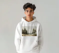 Tranquilla scena di foresta con alberi alti con foglie autunnali vivaci, grandi funghi rossi con macchie bianche circondati da erba e rocce e un'atmosfera nebbiosa con alberi di conifere lontani.
