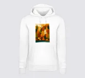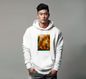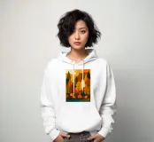 Una foresta nella stagione autunnale. Gli alberi hanno uno stile minimalista e geometrico, con forme lisce e arrotondate e blocchi solidi di colori caldi e terrosi in arancione bruciato, giallo senape intenso, verde oliva e ricco marrone arrugginito che dominano la tavolozza. Il fogliame è semplificato in forme triangolari e ovali, creando un motivo ritmico moderno.